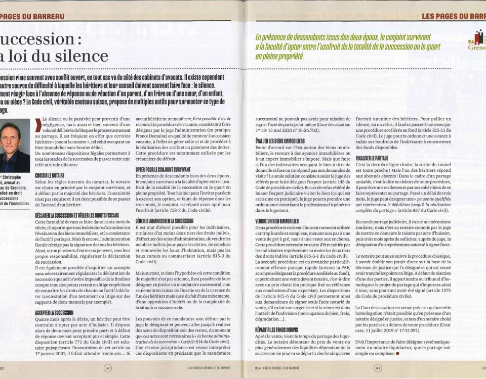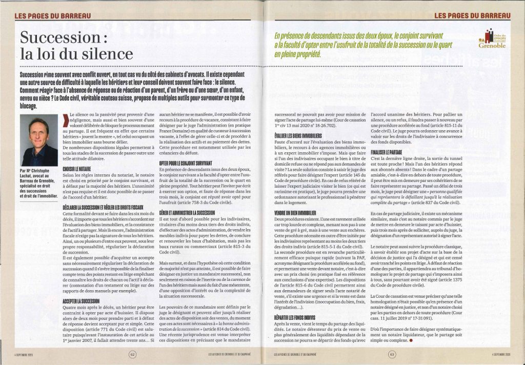 Dernier article de Maitre Lachat dans les Affiches de Grenoble et du Dauphiné: Succession: la loi du silence?
