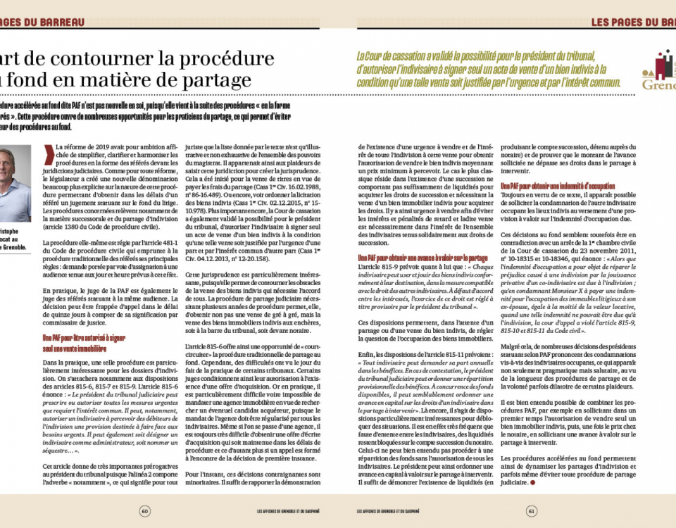 Dernier article de Maitre Lachat dans les Affiches de Grenoble et du Dauphiné: L'art de contourner la procédure au fond en matière de partage. Lire la […]